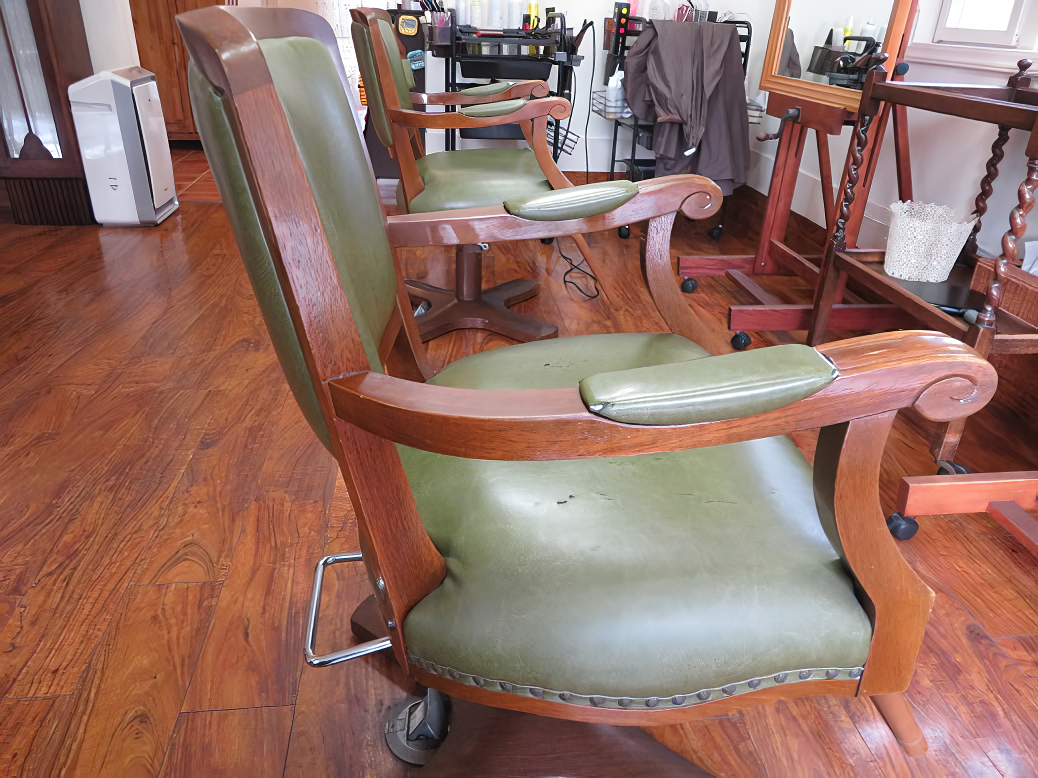 美容室のカットチェアを張り替えました。キズや剥がれの目立つ表皮を張り替えて、快適にお使いいただける仕上りになりました。さらに、滑り落ちにくいよう座面前方のクッションを高く調整し、座り心地も向上しています。お客様のご要望により、ボタン締めでアクセントを加え、上質で洗練された印象に仕上げました。
